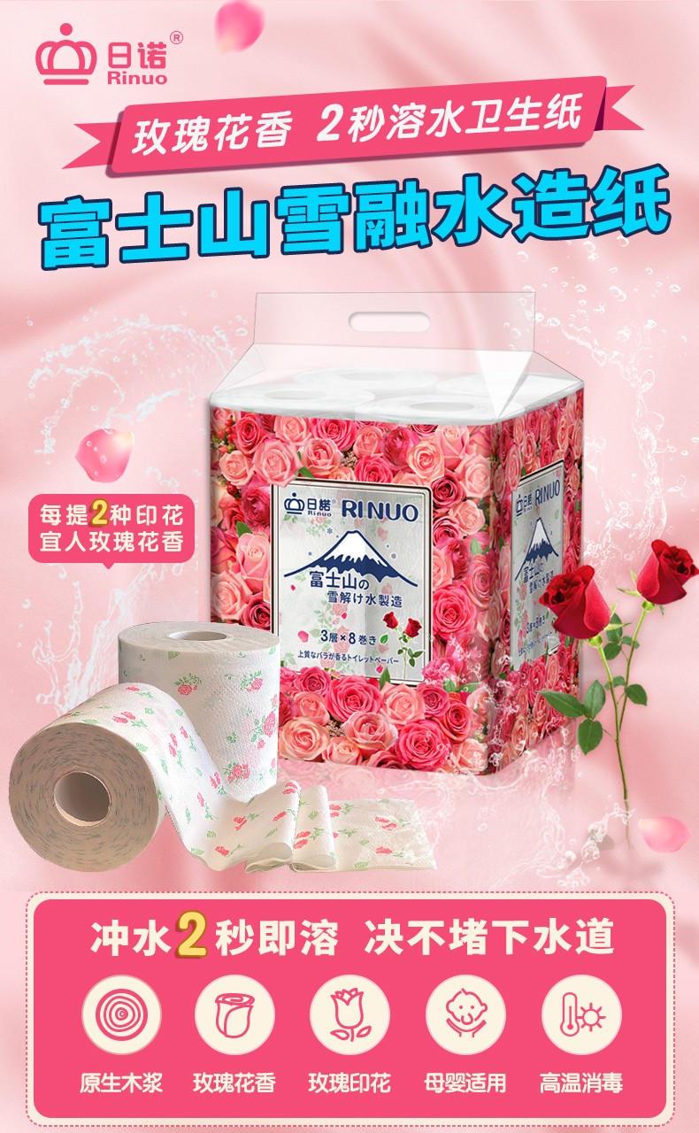 日諾日本進(jìn)口玫瑰花香卷筒紙印花衛(wèi)生紙可溶水溶廁紙有芯卷紙8卷